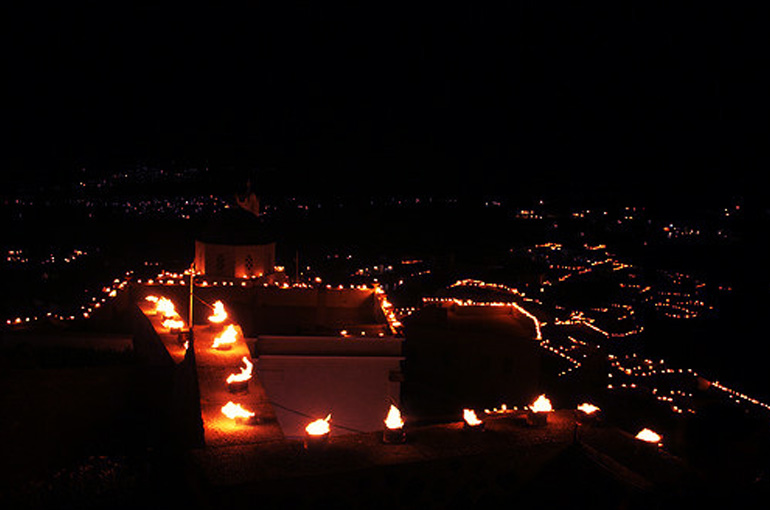 Good Friday in Pyrgos village: A spectacular experience of thousands of candles enlightening the village, creating a mystical and unique ambient, worth to live! The entire village (every house, every roof top, every church, every path) is lit and, while approaching Pyrgos from below is one of the most incredible sights you will ever see. The village is ablaze and the procession starts to meander through the tiny streets and laneways. Hundreds of people holding candles line the narrow streets and slowly follow the procession around the village.